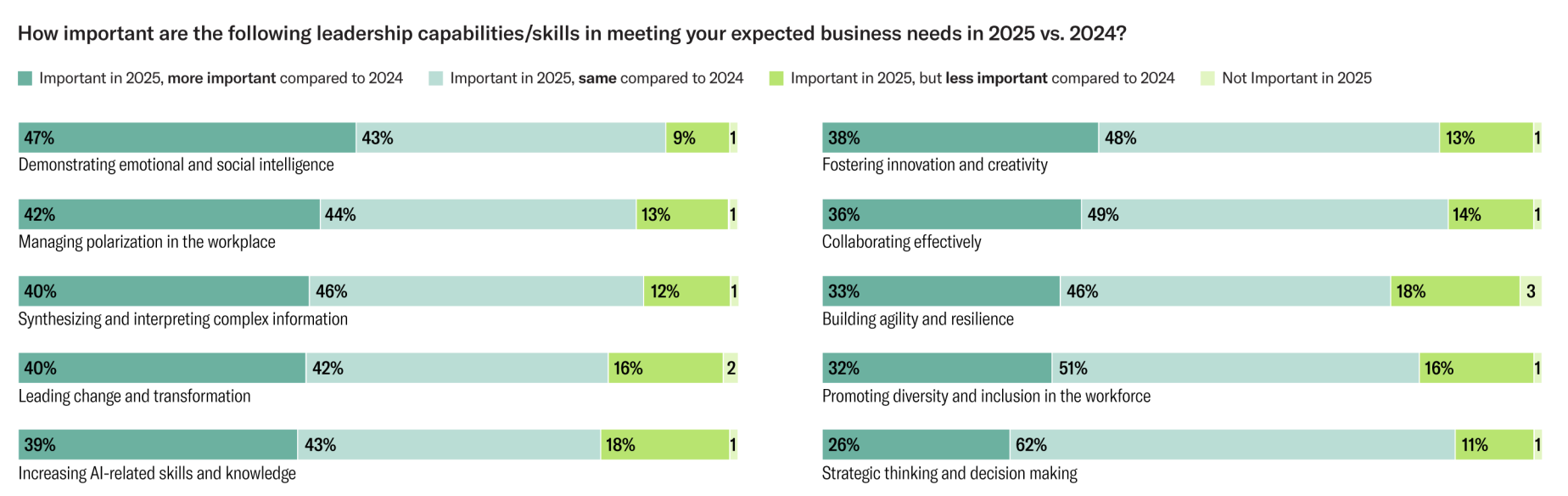 According to a 2025 Harvard Business Impact report, emotional and social intelligence remain at the top of the leadership capabilities list when it comes to meeting current and expected business needs. Almost half of their respondents believe that social and emotional intelligence is even more critical than it was in 2024. Emotional intelligence and human empathy also comes in at the top.